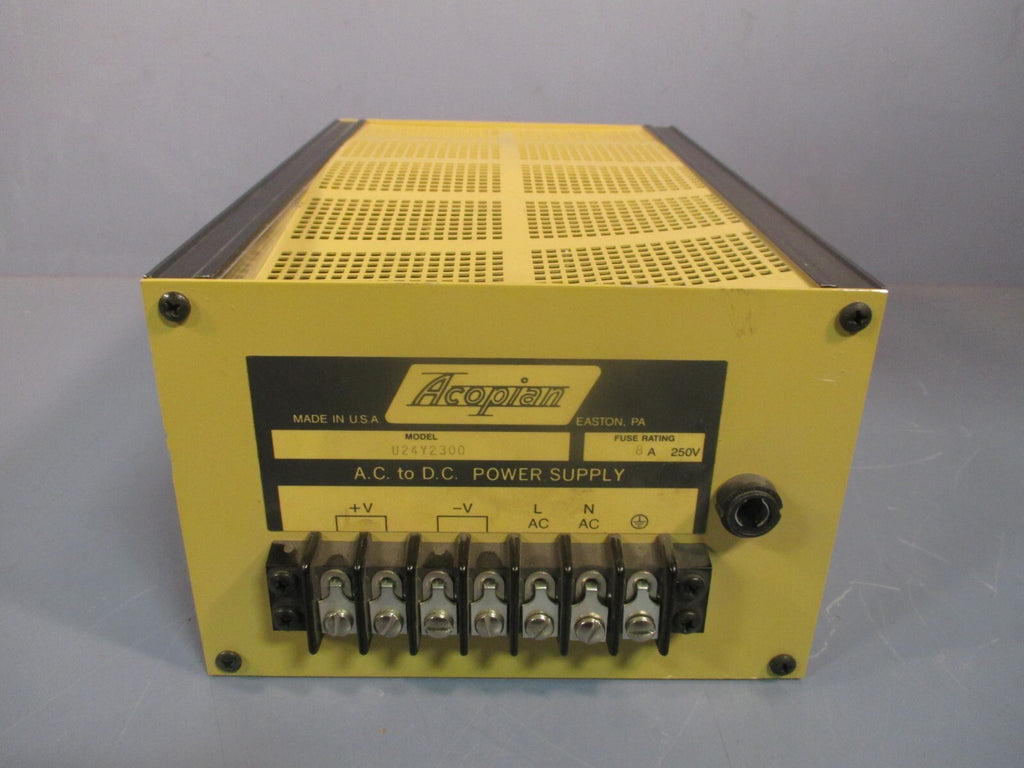 For sale is a Acopian A.C. To D.C. Power Supply 8A 250V U24Y2300. The unit appears to be in used condition. The unit may show slight signs of cosmetic wear from the previous owner such as scratching, discoloration, shelf wear, paint chipping and/or other markings that should not impact the unit's performance. The unit includes everything shown in photos.