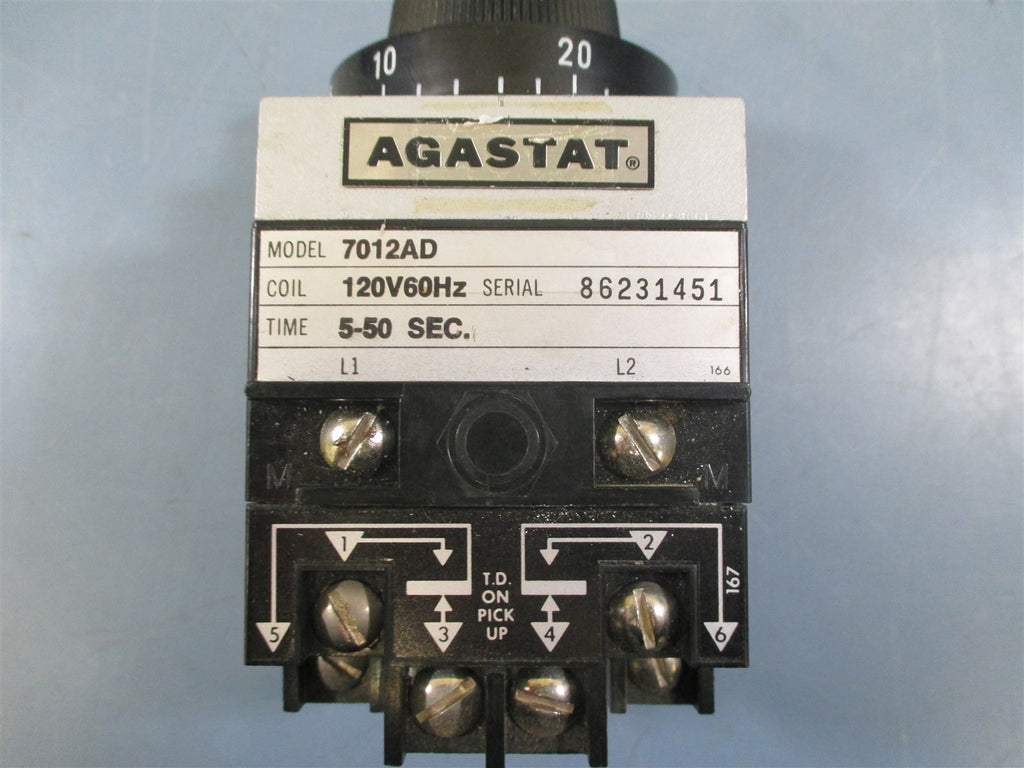 For Sale is a Agastat 7012AD 5-50Sec 120V 60Hz Timing Relay. This item appears used with no major signs of wear or mounting. The overall condition of this item is great.