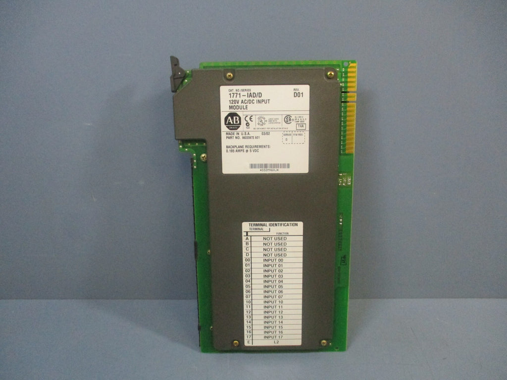 Allen-Bradley 1771-IAD/D Rev. D01 Ser. D For sale is a Allen-Bradley 1771-IAD/D Rev. D01 Ser. D 120V AC/DC Input Module. The unit may show slight signs of cosmetic wear from the previous owner such as scratching, discoloration, shelf wear, paint chipping...