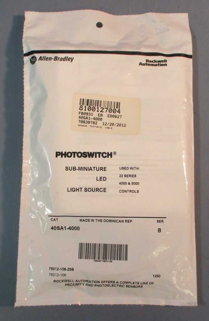 For sale is a Allen-Bradley Photoswitch 40SA1-4000. The unit appears to be new and unused by the previous owner. The unit may show slight signs of cosmetic wear from the previous owner such as scratching, discoloration, shelf wear, paint chipping and/or other markings that should not impact the unit's performance. Overall the unit appears to be in excellent, new, ready to use condition. The unit includes everything shown in photos.