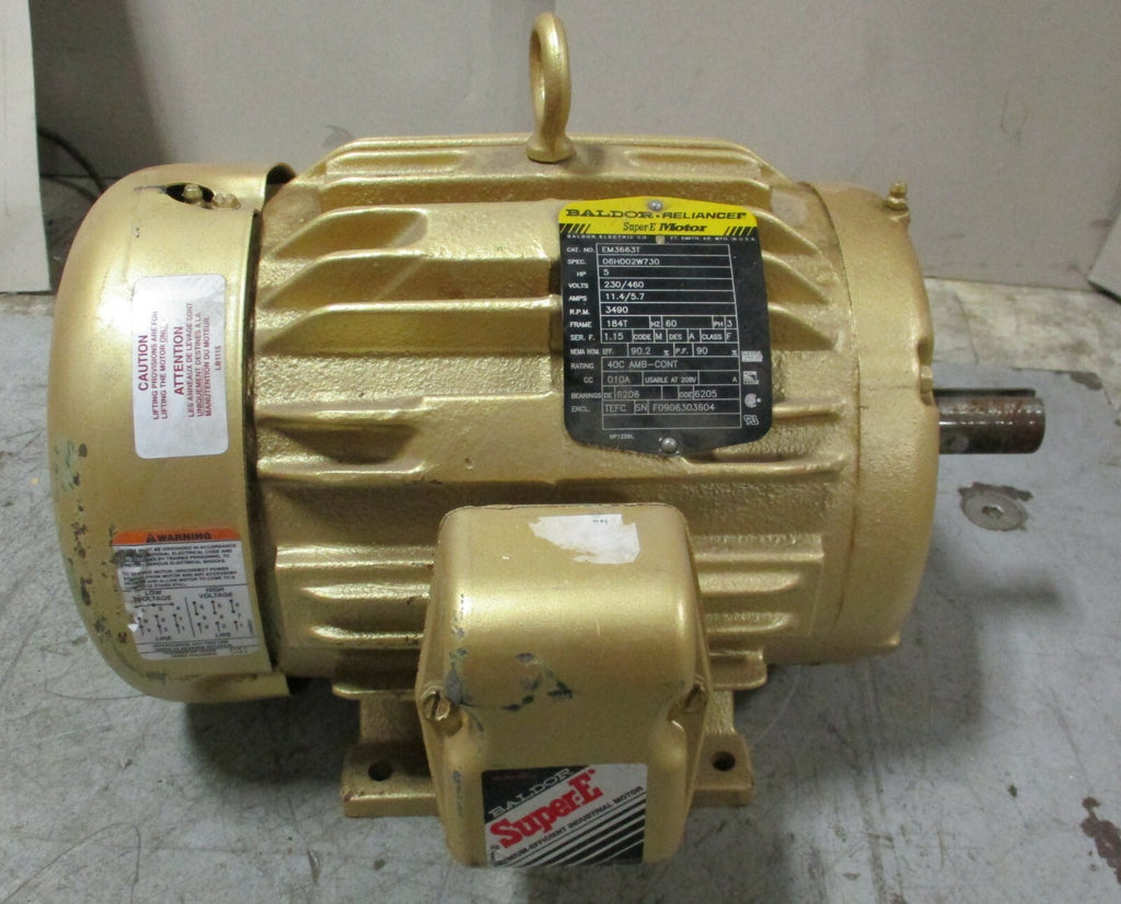 Super-E Motor For sale is a Baldor Reliance EM3663T Super-E 5 HP Motor 3490 RPM, 3 Phase, 230/460 Volt, 184T Frame. The unit is new but no longer in the original package. Wiring inside junction box shows no signs of...