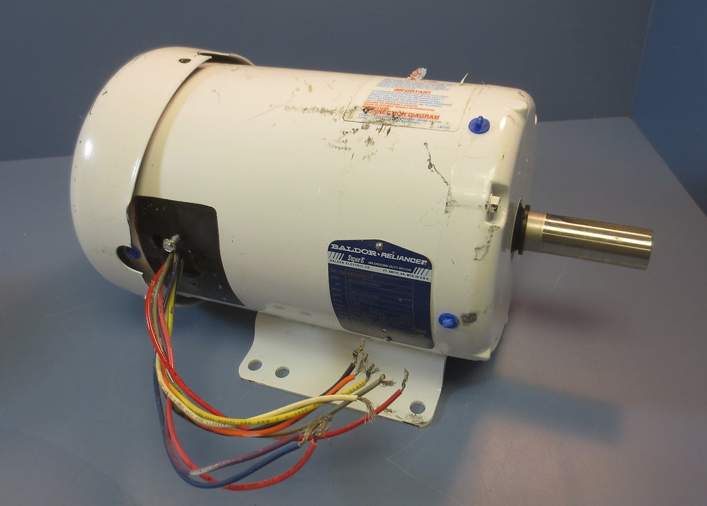 AC Motor For sale is one Baldor Super-E AC washdown duty motor. Item is used. Unit shows signs of cosmetic wear, including scratches and scrapes. The motor's fan guard its bent in and missing screws, and one of the blades...