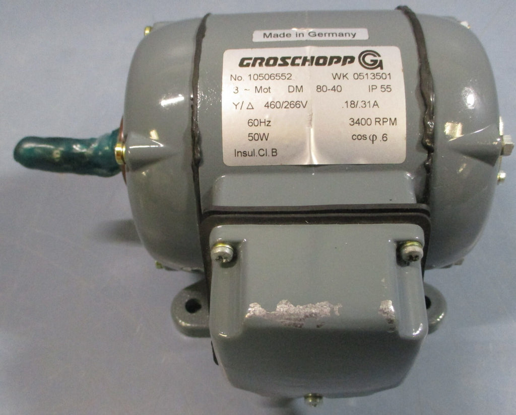 For sale is a Groschopp WK 0513501 Worm Gear Motor 3400RPM, .18/.31A, 50W, 460/266V, 3PH, 5/16" Shaft Dia. Item appears new and in excellent condition. Will come as shown and with what is pictured. May show minor imperfections from shelf wear but nothing that will impact performance.