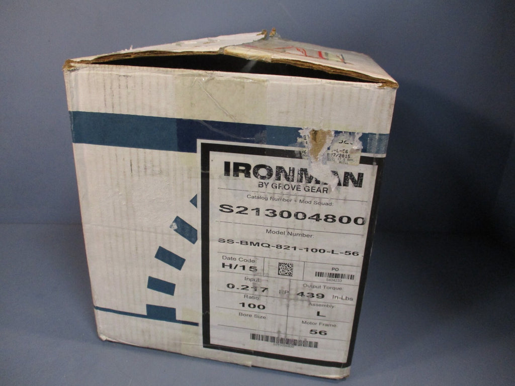 For sale is a Grove Gear Ironman Gearbox Ratio 100:1 56C, 17.5 RPM SS-BMQ-821-100-L-56. The unit appears to be new and unused by the previous owner. The unit may show slight signs of cosmetic wear from the previous owner such as scratching, discoloration, shelf wear, paint chipping and/or other markings that should not impact the unit's performance. Overall the unit appears to be in excellent, new, ready to use condition. The unit includes everything shown in photos.