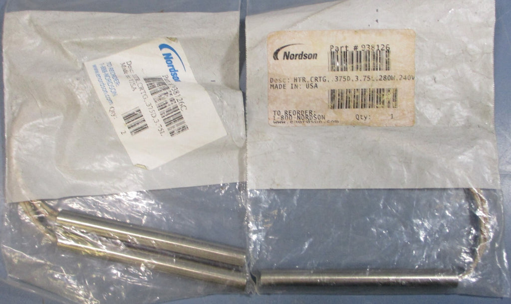 Heater Cartridge For sale is a (Lot of 3) Nordson 938126 Heater Cartridge 3/8" Dia. 3-3/4" Long 240V 280W. Item appears new and in excellent condition. Will come as shown and with what is pictured. May show minor imperfections from shelf...