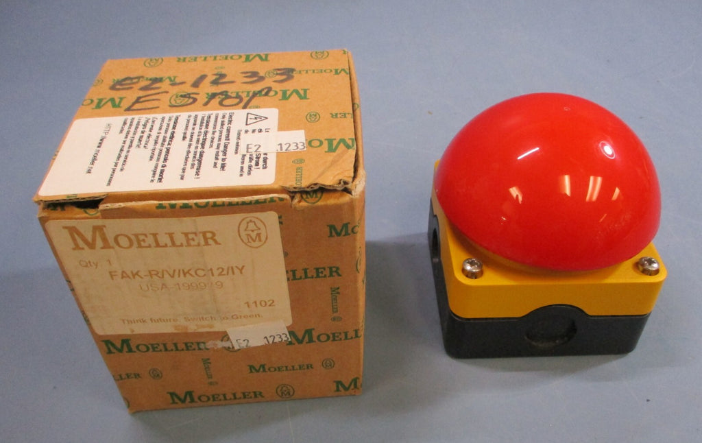 Emergency Stop Push Button Switch For sale is a Moeller FAK-R/V/KC12/IY Emergency Stop Push Button Switch. Item appears new and in excellent condition. Will come as shown and with what is pictured. May show minor imperfections from shelf wear but nothing...