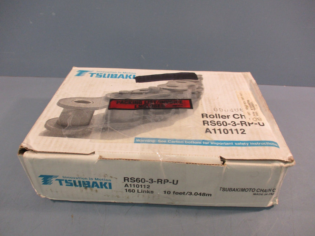For sale is a TSUBAKI 10 Feet 3.048m Roller Chain RS60-3-RP-U, 160 Links A110112. The unit appears to be new and unused by the previous owner. The unit may show slight signs of cosmetic wear from the previous owner such as scratching, discoloration, shelf wear, paint chipping and/or other markings that should not impact the unit's performance. Overall the unit appears to be in excellent, new, ready to use condition. The unit includes everything shown in photos.