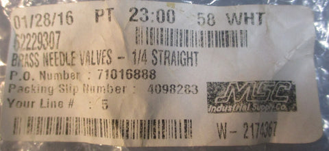 MSC Industrial Supply 62229307 Brass Needle Valve 1/4" Straight Max Lot of 2