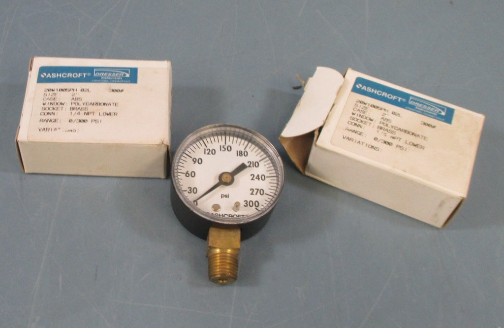 Pressure GaugeFor sale is a Lot of 2 Ashcroft Dresser 20W1005PH 02L 300# Pressure Gauge 300 PSI with 2" Face. The gauge is new and still in the original package. The box shows cosmetic imperfections from the previous owner. The...