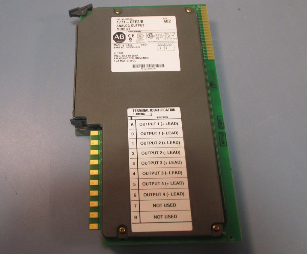 Analog Output Module For sale is an Allen Bradley 1771-OFE2/B Rev. AB2 Analog Output Module Series B. The module is used and came from a working environment. The unit will not come with a terminal strip. Some light signs of use, wear, marking and/or discoloration may show from the previous owner. None of these slight use imperfections will impact the performance of the product. Overall the module remains in very good condition.