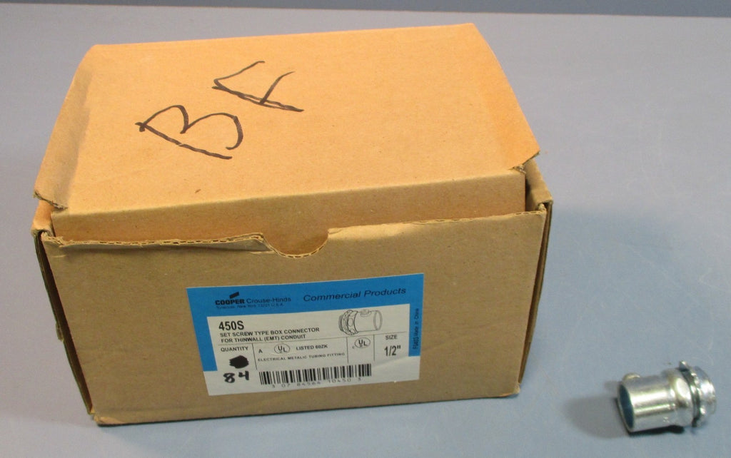 Conduit Box Connector For sale is a Box of 84 Crouse-Hinds 450S Set Screw Thinwall Conduit 1/2" Box Connector. The connectors are new and still in the original box but 34 pieces have been added to the original 50 that were in the box. The box may show some signs of shelf wear, marking, stickering and/or discoloration from the previous owner. The fittings remain in excellent, ready to use condition overall.