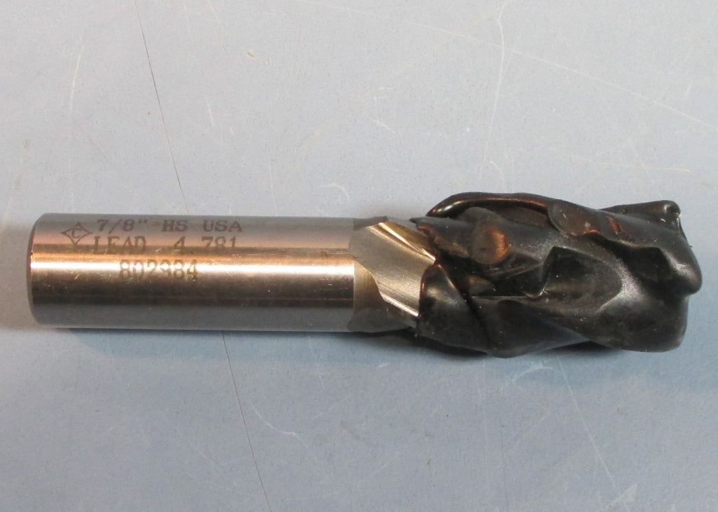 End Mill For sale is a Cleveland 7/8" HS 802984 Lead 4.781 Professionally CNC Resharpened 4 Flute End Mill. The mill is used but has been sharpened and kept in protective wax. The cutting edge that is exposed appears in excellent overall condition. Some light signs of wear, use and/or discoloration may appear from the previous owner. Note that the cutting diameter may be slightly reduced from the sharpening.
