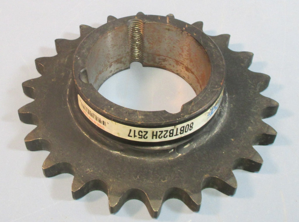 For sale is a Martin 80BTB22H 2517, 22 Tooth Single Row 1" Pitch Taper Lock Sprocket.  The item appears to be new show no signs of tooth wear but not in any packaging.  The item shows signs of shelf wear including dents, scratches, missing/warn paint, surface rusting and/or discoloration.  None of the slight imperfections that show should impact the performance of the product.  This sprocket was found stacked in a pile of other similar items which would account for the shelf wear.  This item shows no signs of actual use.  Overall the item remains in very good condition and is ready to use.