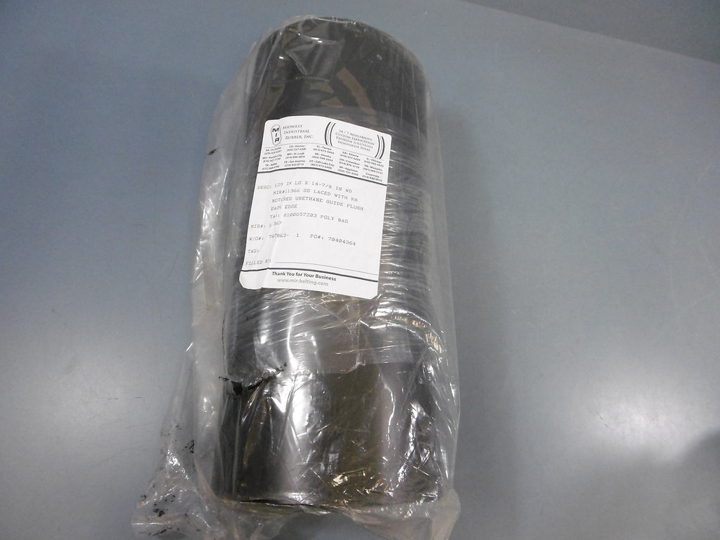 Belt For sale is a new conveyor belt 129" x 14-7/8" ss laced ends, k8 urethane guide, flush top rubber. This belt appears to be brand new with no signs of use or installation.