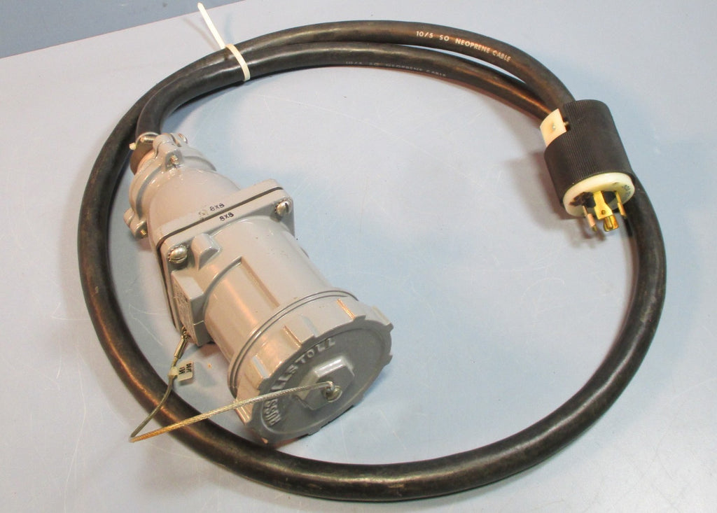 Waterproof Plug For sale is a Russellstoll DS3516FP Waterproof 5 Prong Female Plug Assembly with L21-30P 5 Prong Male Plug. The female end is 30A 3Ø Y 120/208V 60Hz connected to a roughly 5 foot neoprene cable with the L21-30P...