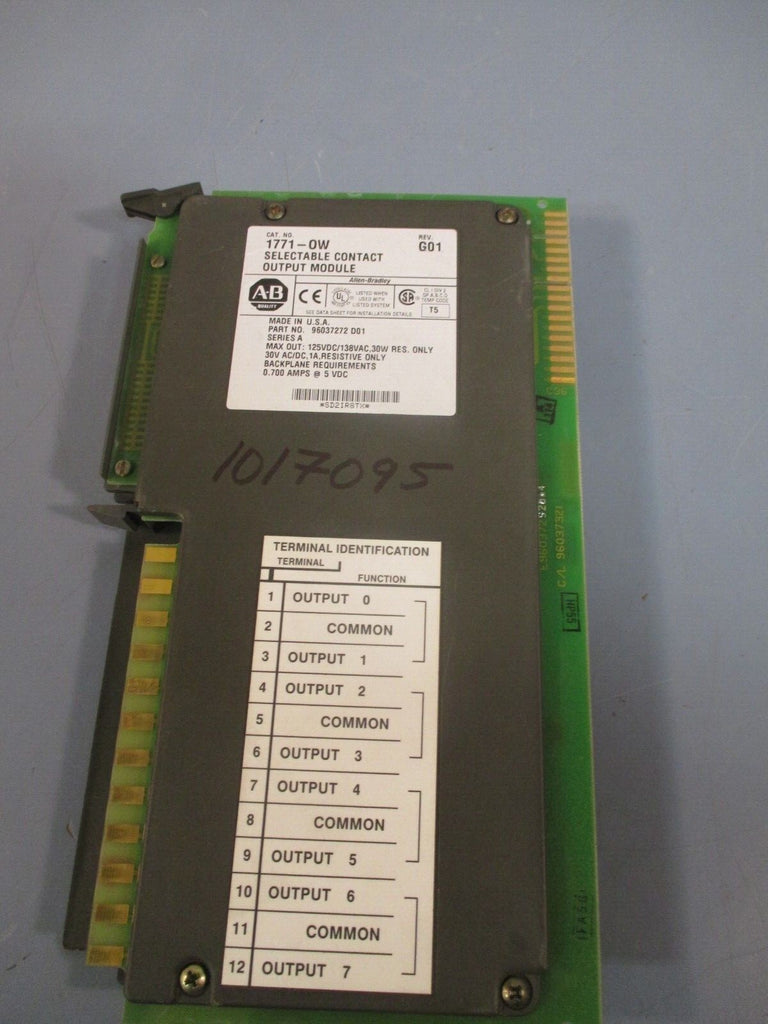 For sale is a Allen-Bradley Selectable Contact Output Module 1771-OW. The unit appears to be in used condition by the previous owner. The unit may show slight signs of cosmetic wear from the previous owner such as scratching, discoloration, shelf wear, paint chipping and/or other markings that should not impact the unit's performance. The unit includes everything shown in photos.